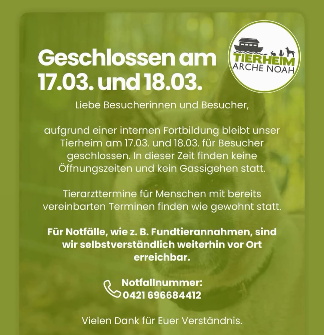 Unser Tierheimteam nimmt am 17.03. & 18.03. an einer Fortbildung teil. Aus diesem Grund bleibt unser Tierheim an beiden Tagen während der Öffnungszeiten geschlossen. Wir bitten um Verständnis.
